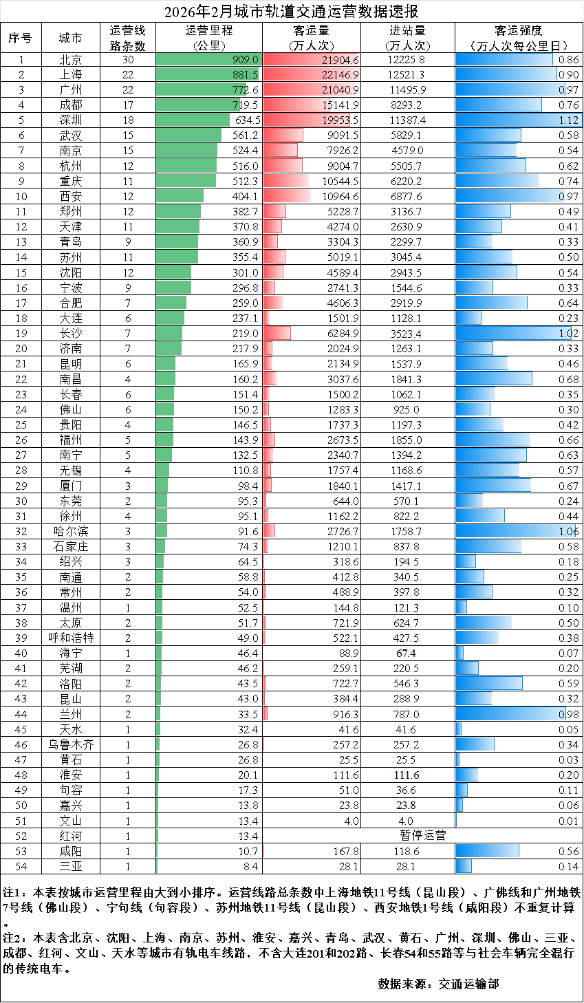 3月10日电 据接通运送部Wechat大众号新闻,2026年2月,31个省(自制区、曲辖市)战新疆消费扶植卒团国有54个乡市通达经营乡市路线接通线道345条,经营历程11778.2千米,现实启队伍车335万列次,竣工客运量21.7亿人次,入站量13亿人次。2月份,客运量环比加少7.2亿人次,落矮25%,共比加少2.3亿人次,落矮9.6%。2月份齐邦总经营历程的均匀客运强度为0.659万人次每千米日。 个中,43个乡市通达经营天铁、沉轨线道283条,经营历程10188.6千米,竣工客运量20.9亿人次,入站量12.5亿人次;18个乡市通达经营单轨、磁浮、市域迅疾路线接通线道27条,经营历程1032.9千米,实行客运量7154万人次,入站量4732万人次;19个乡市灵通经营有轨电车、主动导背路线线道35条,经营历程556.7千米,告终客运量924万人次,入站量887万人次。 原月新删经营历程10.9千米,新删经营区段1个,为沉庆路线接通4号线西延长段。
